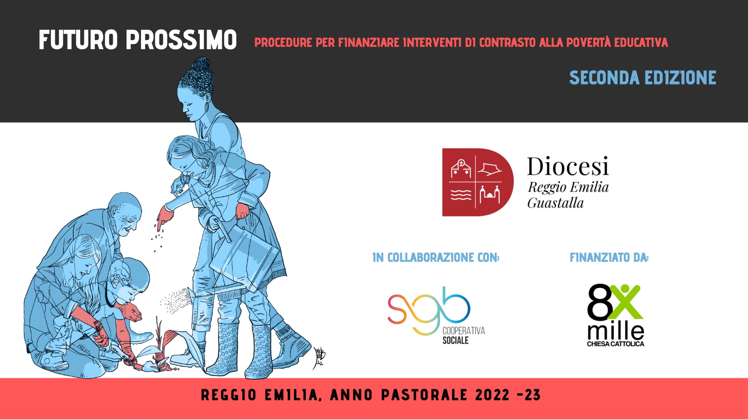 Dopo una ricerca e una profonda riflessione il nostro intento si è fatto più ambizioso rispetto a quello delle precedenti edizioni e con “Futuro prossimo” ci proponiamo non solo di finanziare interventi puntuali ma anche intere progettualità comunitarie e di farlo promuovendo l’adozione di una metodologia d’intervento di rete e relazionale da parte del territorio. Rispetto al passato non siamo soli ma condividiamo l’impegno con gli operatori pastorali della Diocesi e la Cooperativa San Giovanni Bosco.