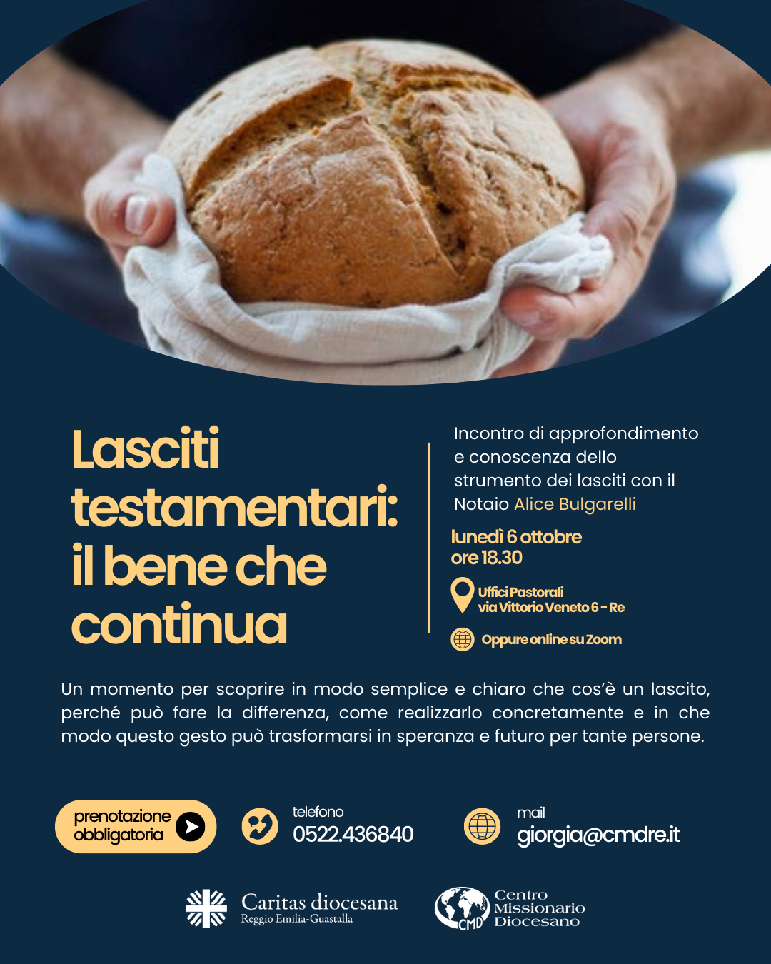 La Caritas Diocesana di Reggio Emilia-Guastalla e il Centro Missionario Diocesano organizzano un incontro dedicato al tema dei lasciti testamentari, non solo come questione legale, ma come atto di fiducia e di solidarietà capace di continuare a vivere oltre la propria esistenza.