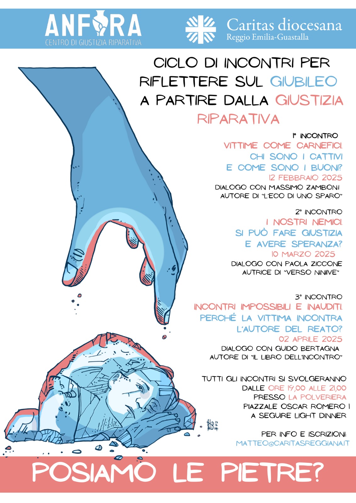 Per il 2025, anno giubilare, abbiamo pensato al ciclo di incontri “Posiamo le pietre?” per riflettere sul Giubileo a partire dalla giustizia riparativa. Lo faremo insieme e in collaborazione con Anfora Centro di Giustizia Riparativa di Reggio Emilia e gli incontri saranno occasione per conoscere tre autori, tre storie, tre libri, secondo il programma allegato.